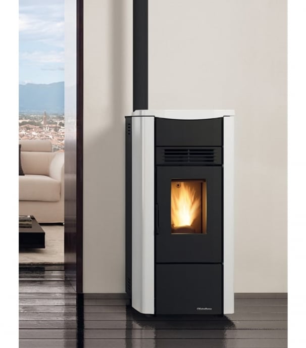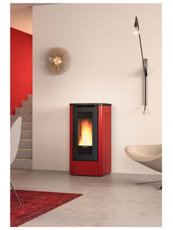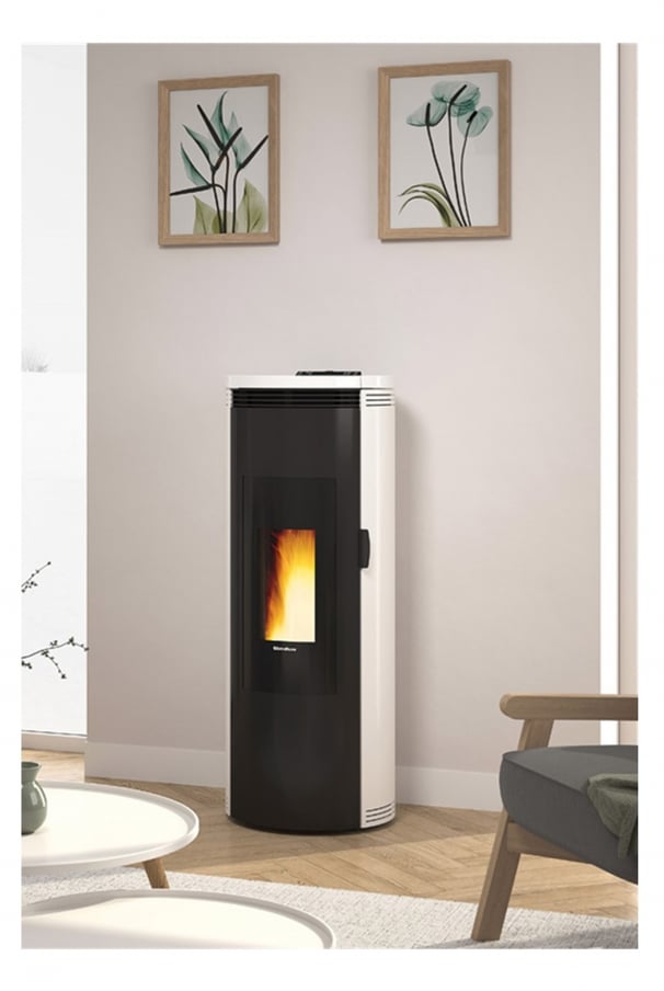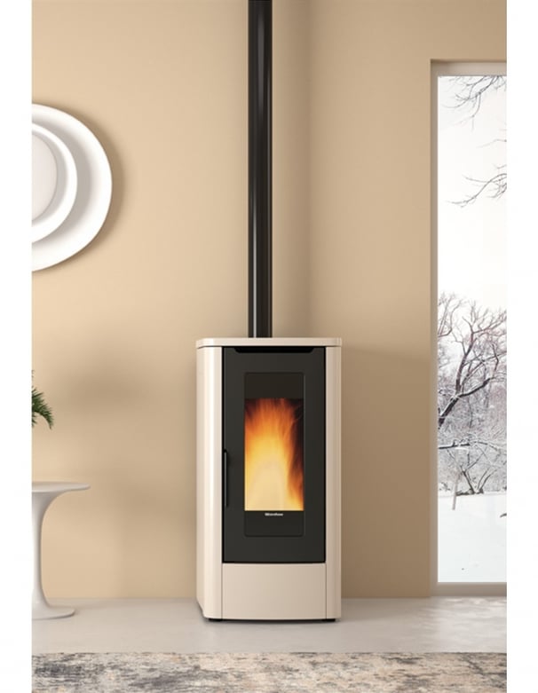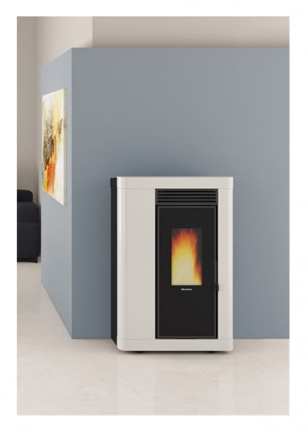 Pelletstoof talen bekleding en gietijzeren deksel • Grote pelletopslagtank (kg~30) • Verwijderbare aslade • Verbrandingskamer, deur en branderkorf in gietijzer • Ingebouwde thermostaat voor kamertemperatuur • Wekelijkse programmatie • Zwart LCD-display • Dubbele tangentiële motor voor kamerventilatie met bovenafzuiging - Dubbele zijbuisbundel warmtewisselaar • Achterste rookafvoer uitgelijnd met het product • Firebox-deur met groot panoramisch venster • OPTIES : wifi module (zwarte etiket) - IR Touch afstandsbediening